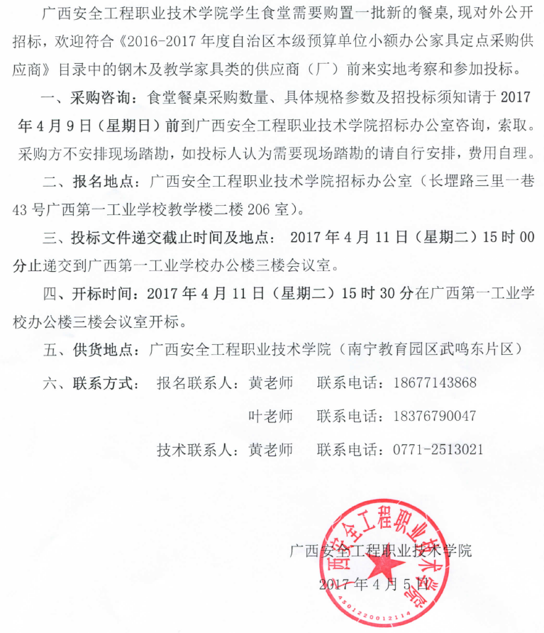 广西安全工程职业技术学院食堂餐桌招投标公告